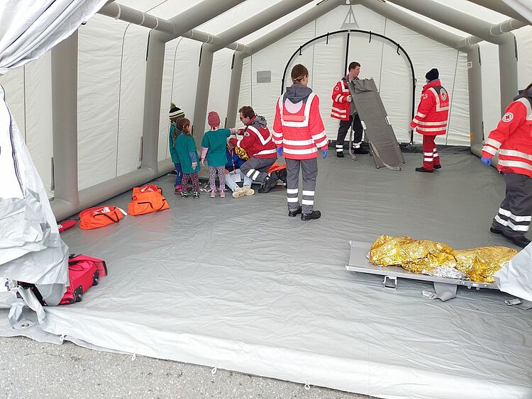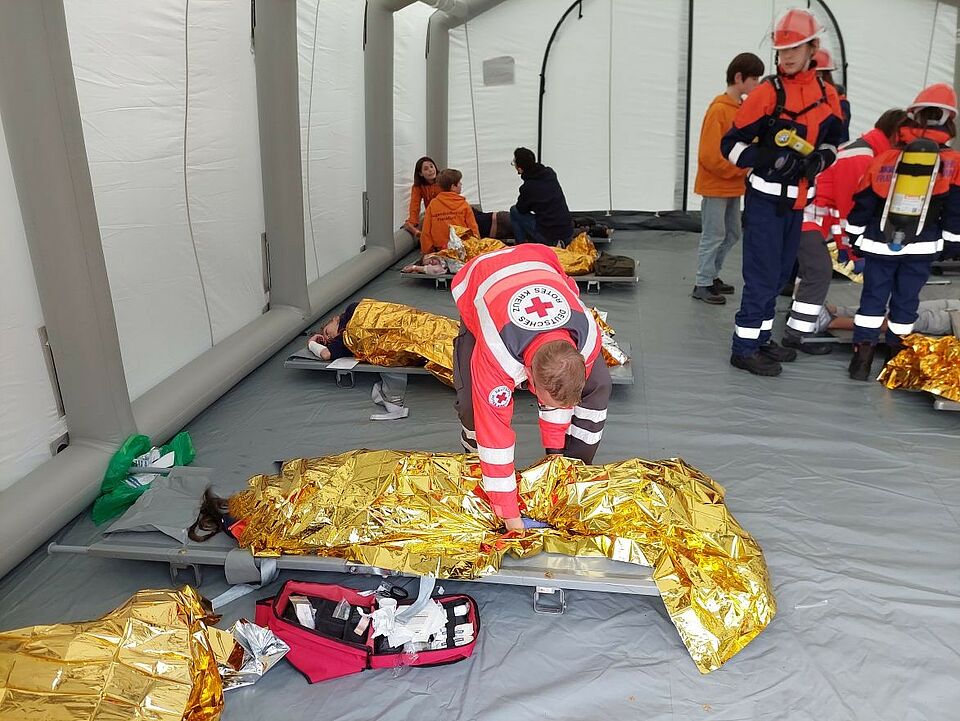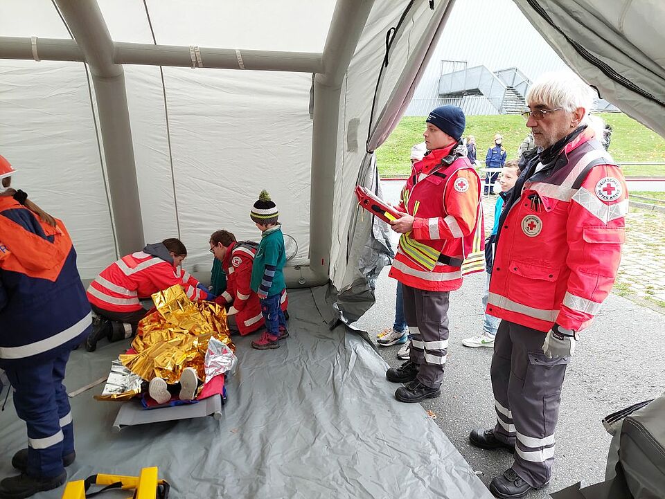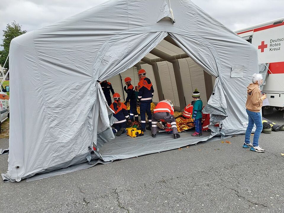 Insgesamt waren acht Kinder und Jugendliche gemeinsam mit ihren Gruppenleitenden und Betreuenden der Bereitschaft im Einsatz. Nach dem Aufbau des Zeltes blieb zunächst Zeit für eine kurze Verschnaufpause, bevor die ersten „Verletzten“ von der Jugendfeuerwehr zur Versorgung gebracht wurden.
